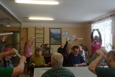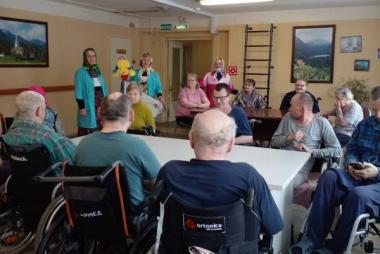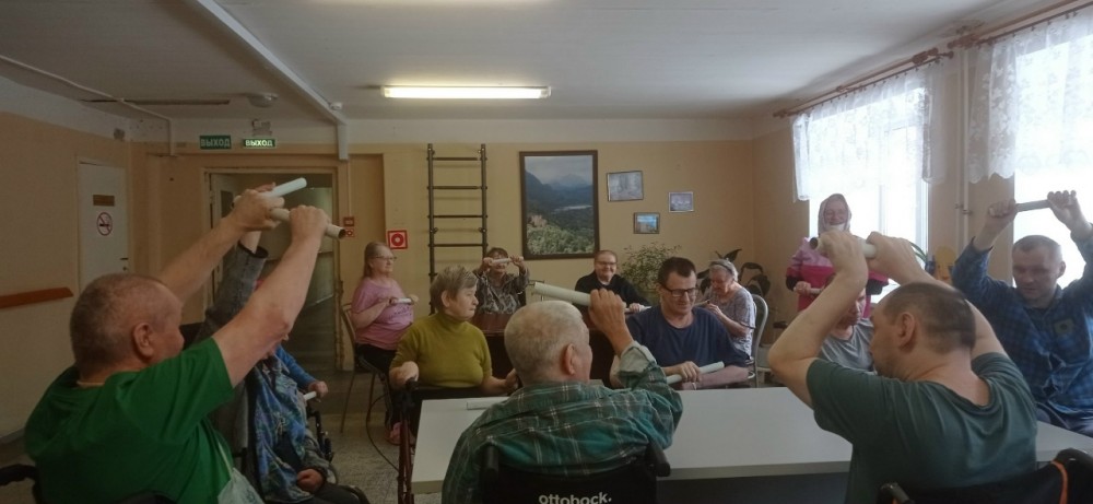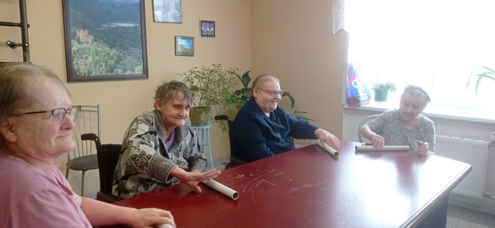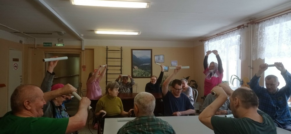 Встретили проживающих "старушки-веселушки" инструкторы АФК Глушакова Г.Н , Семёнова Т.В. и библиотекарь Иевлева С. В. ,которые пели веселые частушки. Участники занятия делали зарядку со скалками - палками, отгадывали загадки.