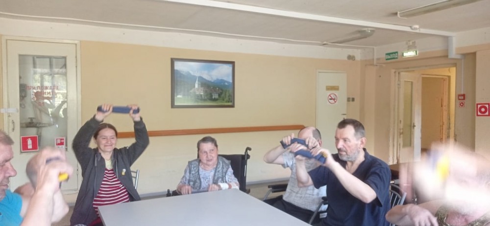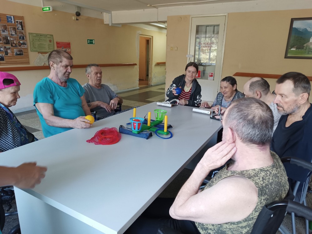 Далее с участниками встречи инструктор по АФК Ефимова М.В. провела комплекс упражнений с использованием мешочков с песком. Все вместе поиграли с мячом . Были задействованы тренажëры для развития мелкой моторики, игра - кольцеброс.