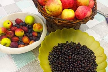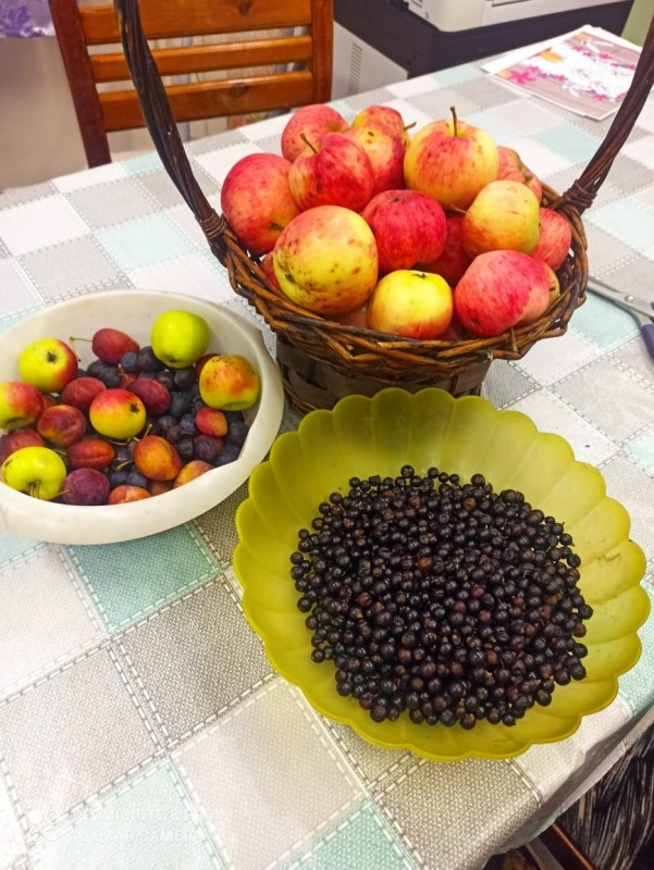 Подготовили все ингридиенты: тщательно промыли яблоки, сливу, чёрную смородину, простерилизовали банки и приступили к занятиям в приподнятом настроении.