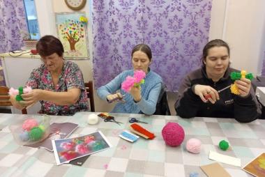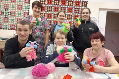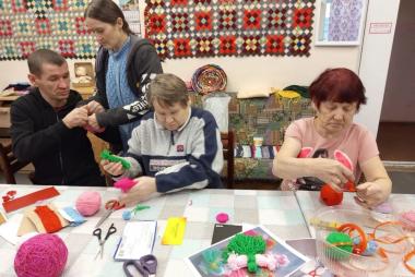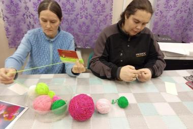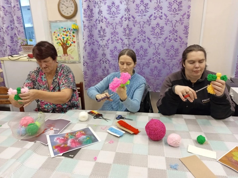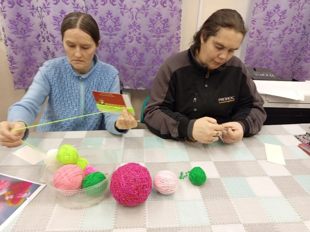 А главное — оживлённо и весело, ведь сегодня инструктор по труду Ильина Валентина Николаевна проводит для участников одно из любимых занятий — изготовление кукол из пряжи. Для работы были выбраны яркие цвета, и каждый выбирал цветовую гамму по своему усмотрению. В процессе работы все заметили, что из обычных клубочков пряжи, если очень постараться, получаются такие милые и яркие куколки! Все усердно и сосредоточенно включились в этот процесс и остались довольны результатом своего труда! Занятия по изготовлению кукол из пряжи способствуют развитию у людей с инвалидностью мелкой моторики, стимулируют мозговую активность и дают возможность для самореализации, а также корректируют и развивают воображение.